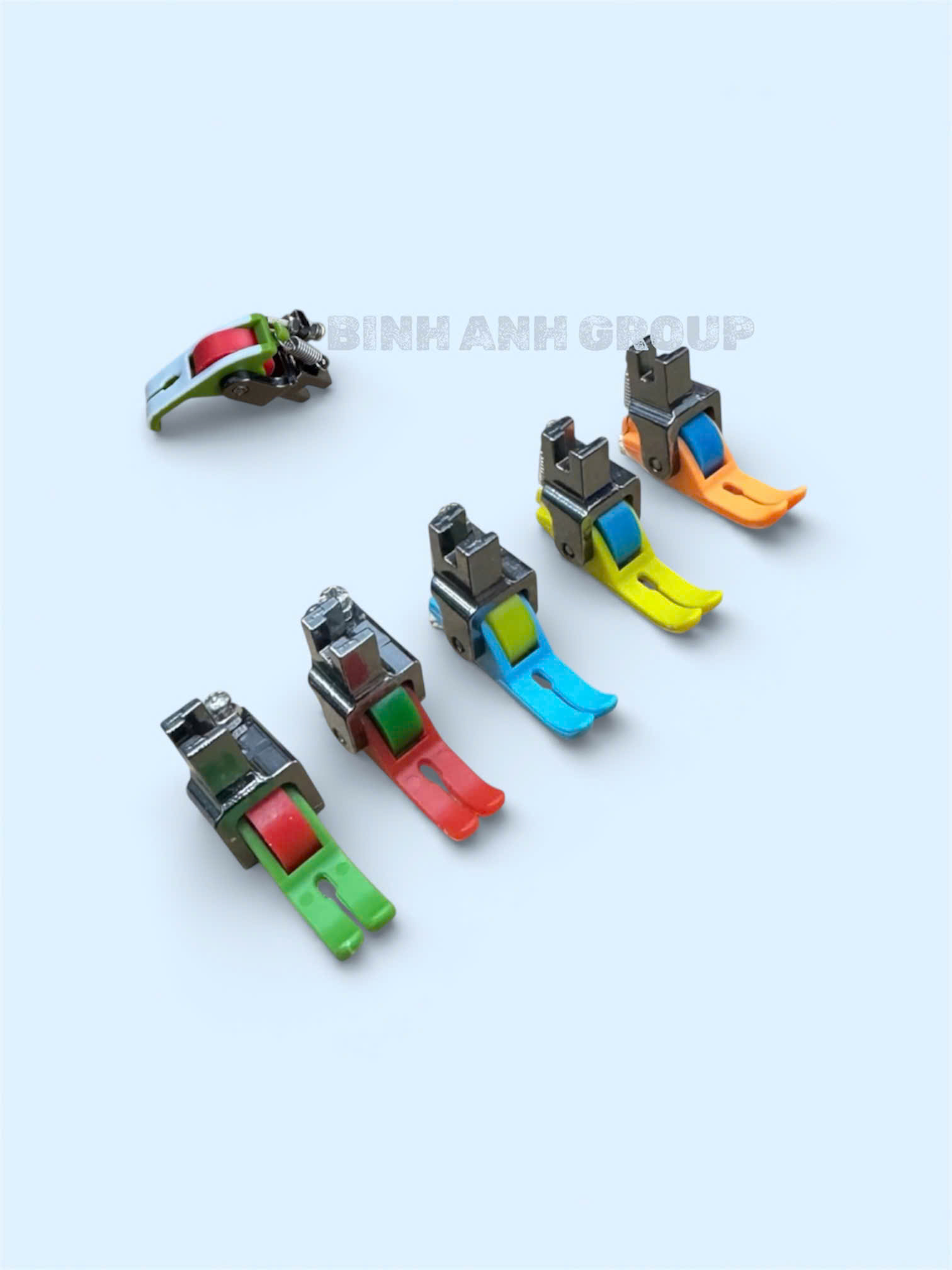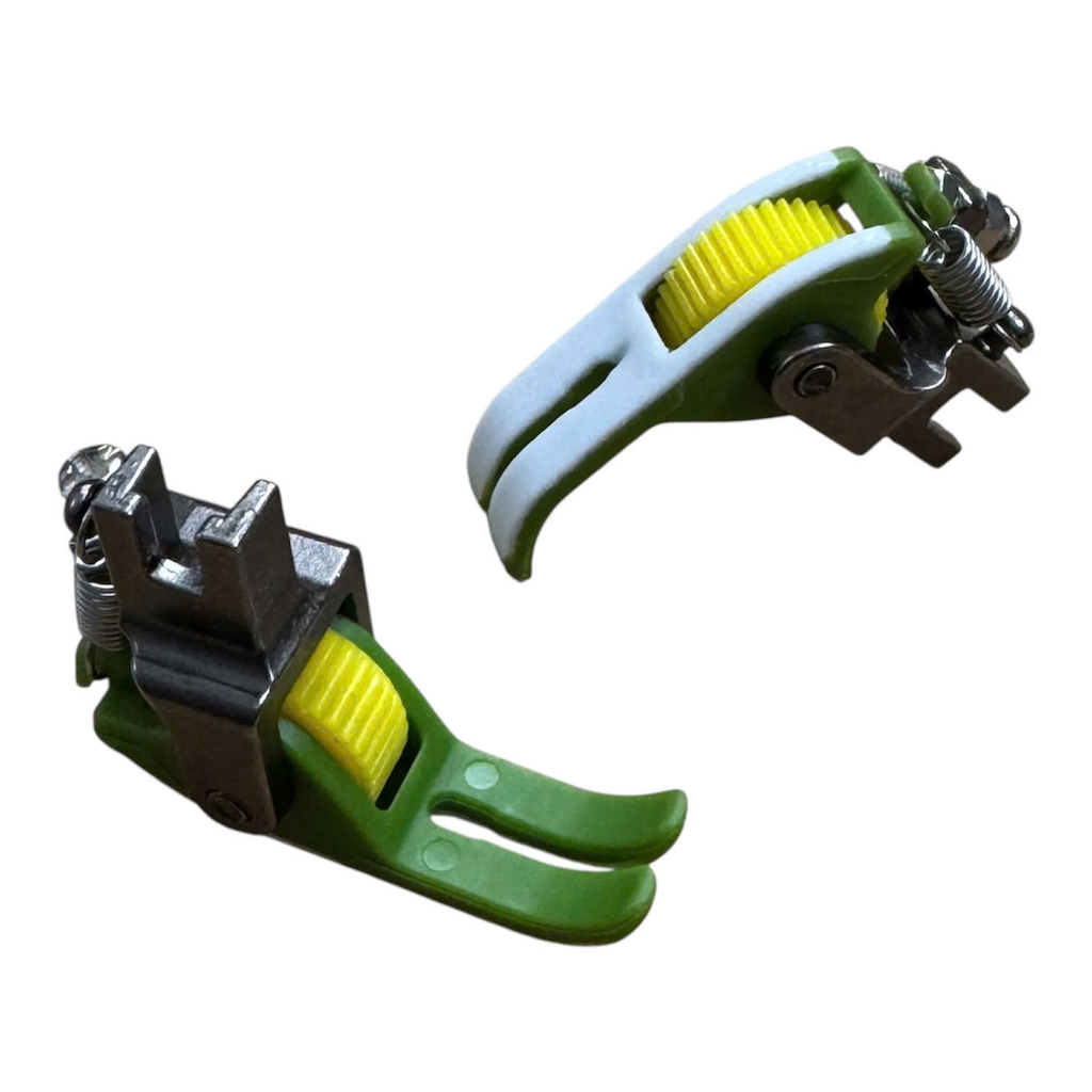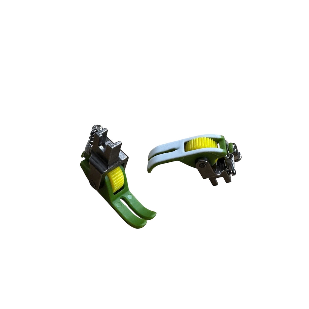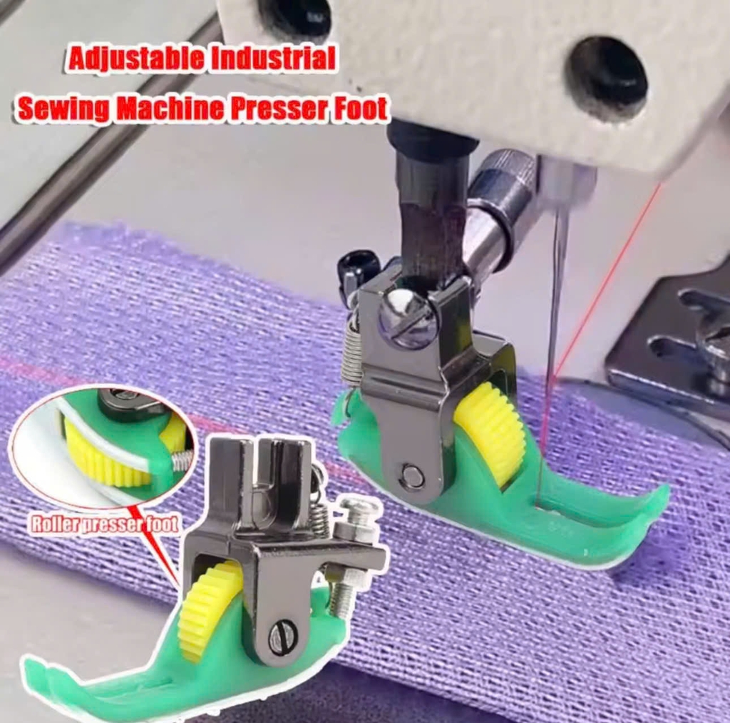 Chân vịt 5 ly bánh xe nhựa chống nhăn. Thiết kế đế nhựa 2 da kết hợp bánh xe nhựa trơn hoặc nhựa răng giúp chống nhăn vải, tăng năng suất đường may.