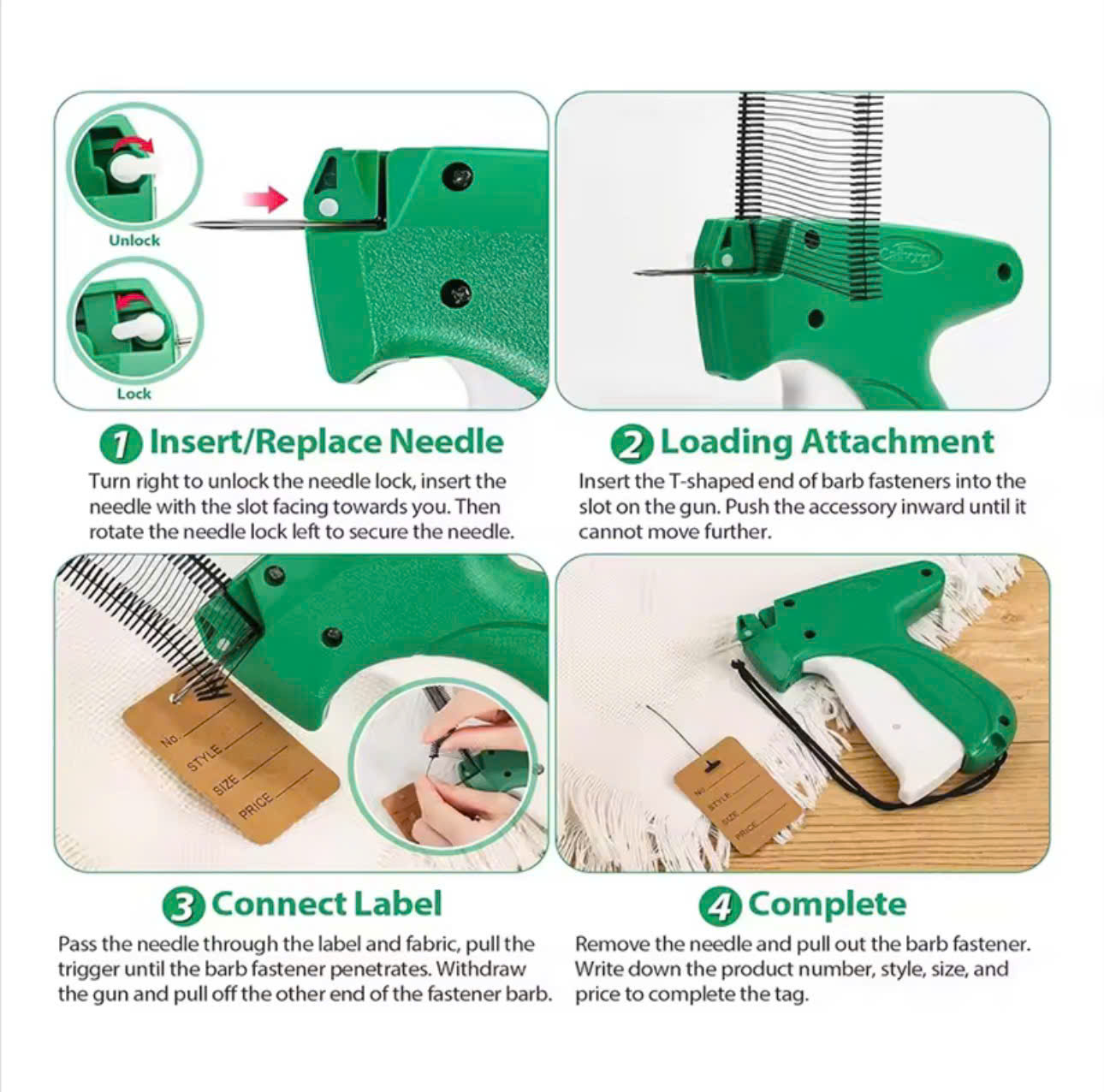 Dùng bắn/ gắn  thẻ bài, giá tiền hoặc thông tin sản phẩm lên hàng hóa là quần áo, mũ nón , giày dép an toàn và nhanh chóng ...